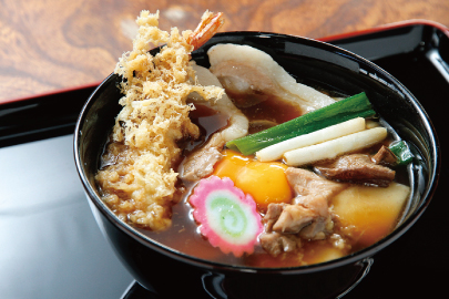 「スタミナそば」はその名の通り、具材も盛り沢山入り、とてもスタミナのつく蕎麦と大好評で遠方からもお越し頂いています。具材は9種類入っており、大きなえび天、鶏肉、豚肉、力もち2ケ、卵、なると、椎茸、竹の子、長ネギ。鶏肉は地産地消で中札内産、豚肉も道内産です。当店のそばメニューは、すべて「うどん」に変更することも可能です。こしのある「さぬきうどん」も是非一度御賞味下さい。